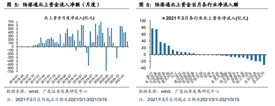 (5)陆港通北上资金流入净额:上周陆股通北上资金净流入87亿元,前一周净流入66亿元。截止2021年3月19日,2021年3月北上资金净流入145亿元,净流入前五名行业是银行、电气设备、交通运输、机械设备、医药生物,净流出行业前五名是食品饮料、计算机、农林牧渔、汽车、轻工制造。