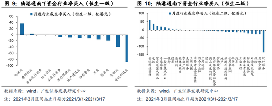 2021年3月(截止3月19日),南下资金净流入41亿元。净买入个股前五为小米集团-W、中国移动、建设银行、中国宏桥、思摩尔国际。恒生一级行业净买入前三名为电讯业、原材料业、非必须性消费,恒生二级行业净买入前三的行业为资讯科技器材、电讯、家庭电器及用品。