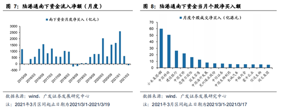(6)陆港通南下资金流入净额:上周港股通南下资金净流入41亿元,前一周净流出156亿元。截止2021年3月19日,2021年3月南下资金净流出99亿元。净买入个股前五为小米集团-W、中国移动、建设银行、中国宏桥、思摩尔国际。