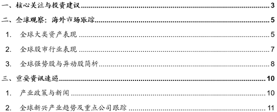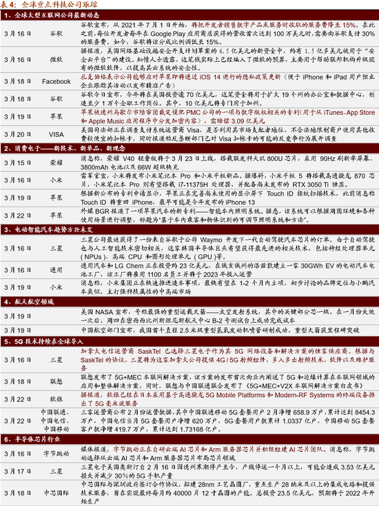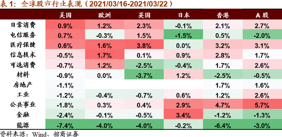 【全球产业趋势】趋势一:半导体产业链。进入2021年,半导体产业链仍然呈现供不应求的状态,上周美股半导体公司纷纷上涨,英飞凌、安森美半导体、意法半导体涨幅均超3%,半导体设备板块的涨幅更加明显,拉姆研究、应用材料、科天半导体、阿斯麦分别上涨4.6%、3.9%、2.1%、5.3%。趋势二:面板。面板价格在3月上旬持续涨价,当前景气度较高。上周全球面板龙头股价上行,群创光电、友达、LG显示分别上涨13.6%、8.7%、1.4%。趋势三:碳中和。碳减排、碳中和已成为全球共识,各国纷纷出台各项政策推进碳中和,建议关注低碳能源、节能节材、循环经济三条主线。