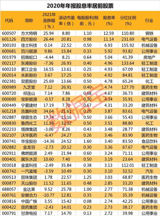 3月18日,四方股份发布2020年报,公司全年归属股东净利润3.4亿元,拟发放现金红利近8亿元。分红比例高达231.69%不说,年报股息率也是达到了11.14%,仅次于方大特钢,相差仅1.4个百分点。