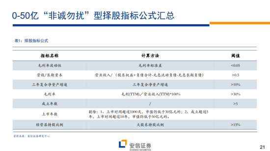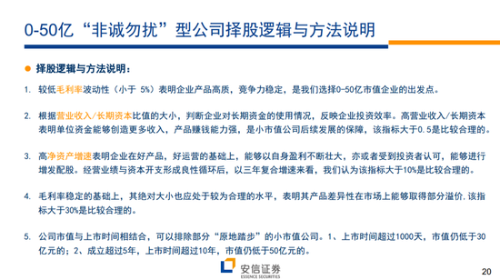 所谓的“非诚勿扰”模型:针对0-50亿市值公司,商业模式以产品竞争力为核心,以毛利率及其波动性为切入点的择股模型。对于不到50亿市值的企业,优秀的产品是诚意的最好体现。在此基础上,通过管理层的运营业绩与持股信心进行二次验证,挑选出商业模式逐渐稳定的潜力股。核心指标:毛利率波动性+营收/长期资本+净资产增速;辅助指标:毛利率+上市与成立时间+经营层持股比例。