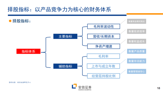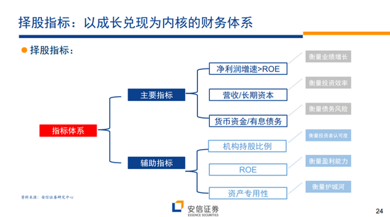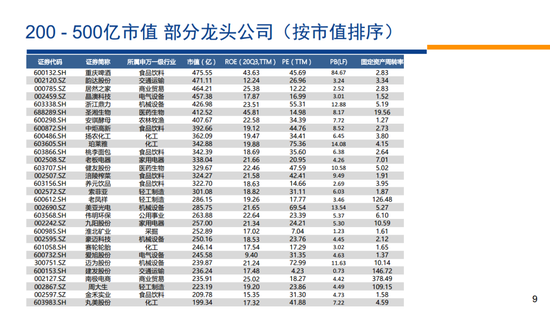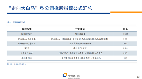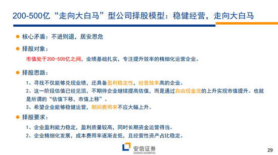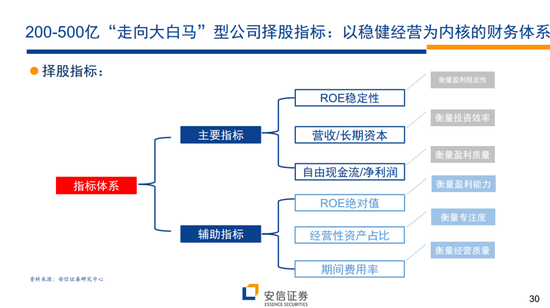所谓的“走向大白马”模型:针对200-500亿市值公司,商业模式以稳健增长为核心,以ROE稳定性为切入点的择股模型。在这一较高市值区间,希望能够找到稳中有进,逐渐释放规模效应的企业,因此选择企业需要拥有稳定回报率,且净利润含金量高。核心指标:ROE稳定性+营收/长期资本+自由现金流/净利润;辅助指标:ROE绝对水平+经营性资产占比+成本费用率。