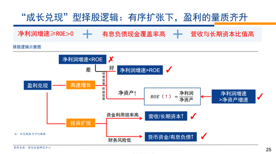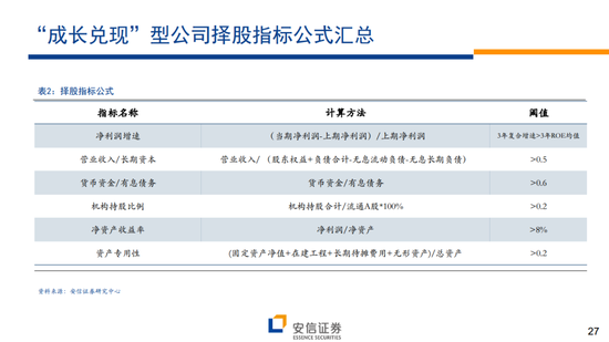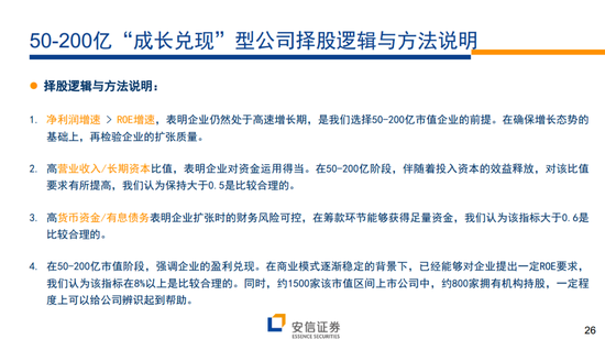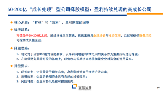 所谓的“成长兑现”模型:针对50-200亿市值公司,商业模式以盈利兑现为核心,以净利润增速为切入点的择股模型。对于这一阶段的企业,其商业模式已经较为固定,因此希望选择那些处于成长态势,财务风险可控,同时保持资金运营效率的企业。核心指标:净利润增速+营收/长期资本+货币资金/有息债务;辅助指标:机构持股比例+ROE绝对水平+资产专用性。