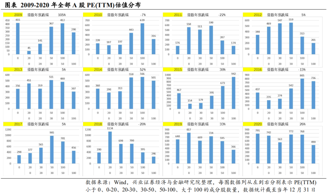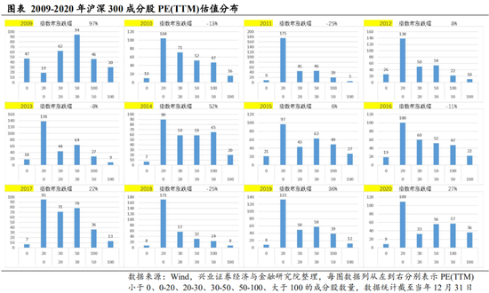从成分股的估值分布情况来看,无论是沪深300还是全部A股,2020年底的估值分布都不如2009年那时重心明显靠右,因此也较难出现2010-2011连续两年大幅杀估值的情况。但整体来看仍然呈现两头高中间低的状态,估值分化情况大概率在2021年出现一定程度的平衡与收敛。