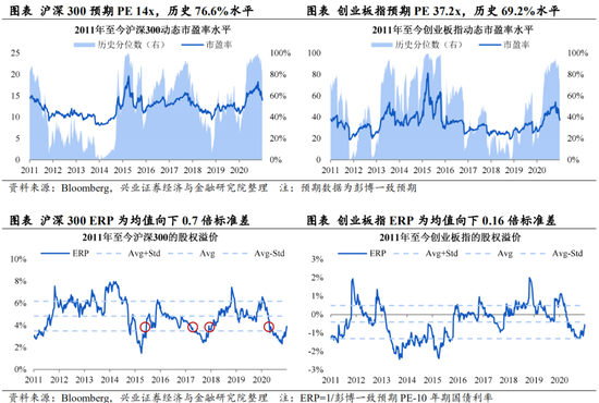 调整后的A股动态估值依然处于历史相对较高水平,但不在极致水位。沪深300远期市盈率和隐含ERP回到2020年7月水平,远期市净率回到2020年9月、11月水平;创业板指远期市盈率、远期市净率和隐含ERP均回到2020年7月水平。如果目前沪深300和创业板指的估值进一步下折10%,那么预期市盈率将分别处于历史54%、50%分位数,预期市净率将分别处于历史71%、76%分位数。