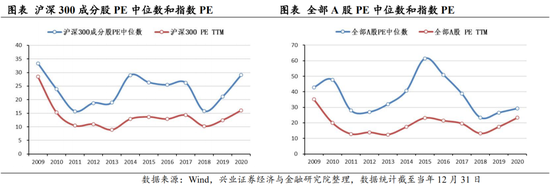 从成分股中位数的角度来看,截至2020年底,沪深300成分股的PE中位数接近30倍,整体估值达到2010年以来的最高水平,但全部A股的PE中位数历史来看并不高,这也从侧面反映出近两年来市场风格演绎趋于极致。
