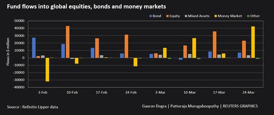 Refinitiv Lipper数据显示,截至3月24日当周,全球货币基金吸金426亿美元,创13周以来最高。与之相对的是,股票基金流入232亿美元,较前一周大幅下降34%。债券基金流入69.4亿美元,环比下降17%。