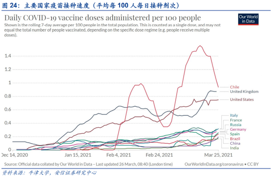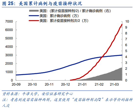 与去年冬季感恩节、圣诞节后的一轮疫情相比,本轮疫情从天气、假期和疫苗普及情况等三大因素来看均有较大改善。因此本轮疫情的蔓延速度和破坏力预计将会显著小于去年冬季疫情,并呈现出疫苗与病毒“竞赛”的特点。变异病毒和疫苗的供给限制或将导致本轮欧洲疫情较美国更加严重。从疫苗接种情况来看,英美当前的接种速度远超欧洲,美国目前累计疫苗接种人数已超累计确诊病例的2倍,而欧洲这一比例仅有1倍。同时,美国总统拜登在就职总统第59天(3月19日),已经提前完成了之前“上任后100天内完成1亿剂疫苗注射”的目标,25日,拜登在其就任后的首场总统新闻发布会上宣布了新的升级版新冠疫苗接种目标:在其履新的头100天内,美国要完成2亿剂疫苗注射。按照美国CDC公布的的每日平均接种冠病疫苗数量约在250万剂左右来计算,这一新目标有望在4月23日(五周内)提前一周完成。