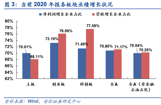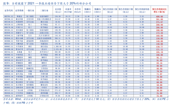 同时,从目前已经披露的年报业绩(含预告+快报)来看,机械、有色、化工、军工、电新、医药等行业全年盈利增长明显,年报业绩高增长群体主要集中在机械、医药、化工、电子、电气设备等领域,大致延续三季报的增长分布和格局。从细分领域来看,目前的年报业绩(含预告+快报)同比增速较2020Q3业绩进一步提升的中信三级细分行业主要在汽车零部件、行业应用软件、医疗器械、消费电子组件、化学制剂、膜材料、生物制药、火电、基础件、集成电路、氯碱、证券和太阳能等。其中,除了此前市场已经形成较为普遍预期品种外,计算机中的行业应用软件与基础软件及管理办公软件、化工中的膜材料、电子中的面板、公用事业中的火电、有色中的稀土与磁性材料在本次年报业绩(含预告+快报)中倒是令人眼前一亮。