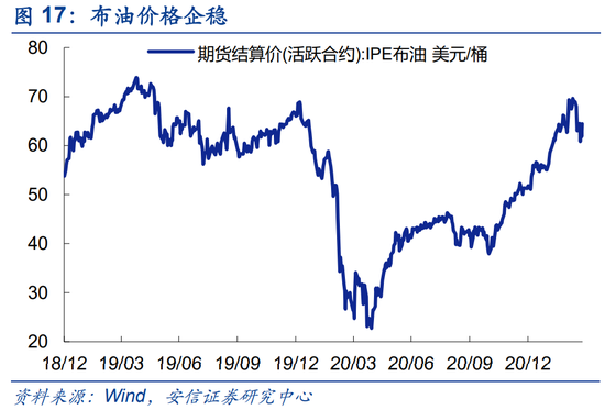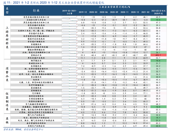 结合最新公布的1-2月工业企业数据来看,低基数叠加“就地过年”推动一季度工业企业利润高速增长,“制造业回归”得到进一步验证,一季度高技术制造业、汽车、电气设备、有色、化工等制造业增速靠前。根据国家统计局在27日公布的最新数据,2021年1—2月份,全国规模以上工业企业利润同比增长1.79倍,比2019年1—2月份增长72.1%,两年平均增长31.2%。同时,1—2月份工业企业营业收入同比增长45.5%,延续了去年下半年以来较快增长的良好态势。除了受疫情影响在去年同期形成的低基数外,今年春节期间鼓励就地过年有力促进工业企业生产加快,效益提升。在行业层面,装备和高技术制造业带动作用明显,1—2月份装备制造业和高技术制造业利润同比分别增长7.07倍和3.08倍,主要是在汽车、电气设备和专用设备领域。其中,从两年平均看,装备制造业和高技术制造业分别增长55.3%、60.2%。同时,原材料制造业利润增势良好,主要是在有色、化工领域。此外,1-2月制造业高景气进一步验证了我们此前提出的“制造业回归”的观点。根据我们此前在专题报告《2021年“制造业回归”的核心抓手是什么?——2021年A股基本面核心因素系列二》中的观点,当前制造业投资修复最大的推动因素在于产能利用率提升+盈利向好的双组合。从当前评估来看,1—2月份工业企业利润率为6.60%,盈利能力显著提升,宏观产能利用率依然在高位,制造业投资增速将有望迎来趋势性回升(2021年1-2月制造业投资数据同比增长37.3%;去年全年为-2.2%,去年1-2月为-31.5%)。
