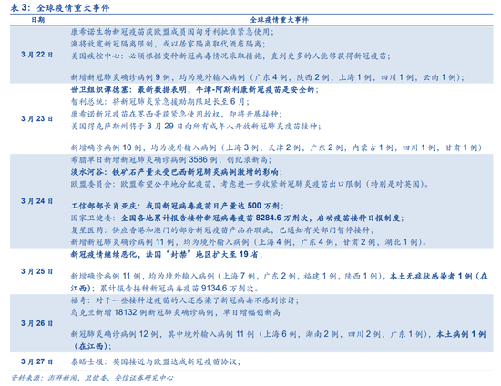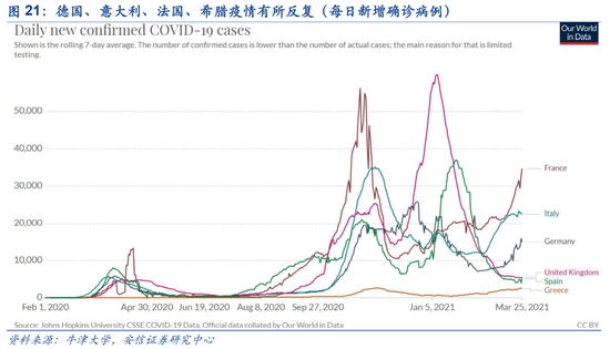 近几周,欧美部分国家疫情有所反复。欧洲地区新增新冠肺炎病例数已连续3周呈上升趋势,最近一周新增病例更是超过120万例。在去年冬季疫情爆发后,欧洲多国实施的封城令成为了控制疫情的关键。而近期在多地解禁的同时,疫苗接种偏慢,欧洲疫情面临新一轮爆发的调整。同时,有分析认为欧洲出现新一波疫情的重要原因是变异新冠病毒的快速传播;德国总理默克尔23日表示,目前德国新增病例数正在呈“指数型”增长,主要原因是传染性更强的变异病毒B.1.1.7快速蔓延。为了应对本轮疫情的蔓延,近一周法国和意大利等国进一步扩大了封锁措施;由于遭到广泛批评,德国原计划4月初在全国范围内进行的为期5天的封锁已被取消。当地时间25日,欧盟27成员国一连两天举行线上峰会讨论疫苗供应等事宜;英国和欧盟发表了一份联合声明,称二者愿意“创造双赢局面并扩大针对所有国家的疫苗供应”。