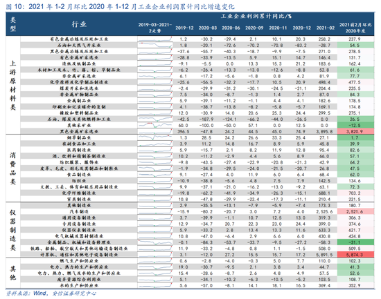 2021年1-2月工业企业利润累计同比增速环比2020年1-12月明显提升前五的行业分别为:计算机、通信和其他电子设备制造业(5874.3pct)、黑色金属矿采选业(3820.9pct)、汽车制造(2521.6pct)、化学纤维制造业(703.2pct)、仪器仪表制造业(621.7pct)。