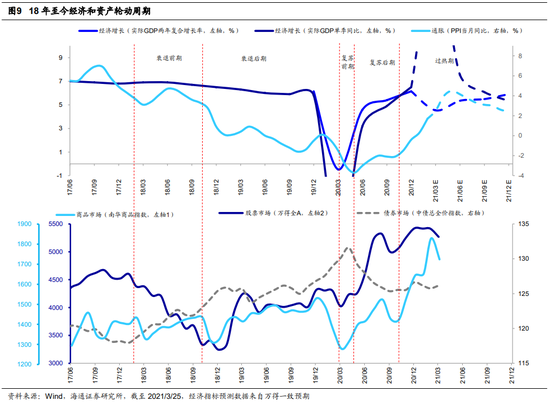 这轮投资时钟始于18年2月,目前处于过热期。本轮投资时钟从2018年的2月开始,期间先后经历了衰退(18/02-20/03)和复苏(20/03-20/10),去年10月至今(截止2021/3/26,下同)已经轮动到流动性边际收紧+基本面向上+通胀向上的过热期。其中本轮衰退从前期进入到后期的标志是在18年10月19日国务院副总理刘鹤及一行两会负责人接受记者采访,此时明确政策进一步转向宽松。此后受疫情冲击经济在衰退后期的末尾大幅下行,直至20Q1GDP增速见底反弹后经济才开始步入复苏前期,5月之后供给冲击的因素渐渐缓和,PPI同比的见底回升标志着复苏来到后期。此后随着去年10-11月社融存量和M2增速相继开始见顶回落,经济进入了过热阶段。回顾本轮大类资产轮动情况: