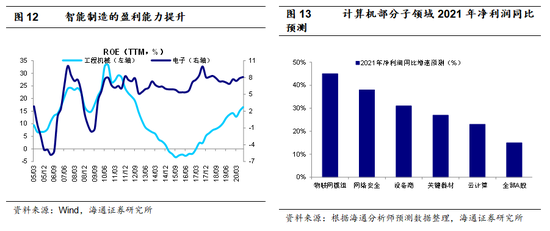第一,智能制造。未来能够引领市场上涨的行业,必然也是利润增速相对较快的行业,而智能制造领域相关行业符合这一特征。过去两年,中国5G引领的信息技术、电动汽车为代表的新能源技术取得了重大突破,部分领域在国际上取得了领先地位,为相关行业发展提供了技术支撑。从政策层面看,强化国家战略科技力量是2021年头号任务,3月13日发布的《中华人民共和国国民经济和社会发展第十四个五年规划和2035年远景目标纲要》正文中开篇第二篇即是与科技创新相关的“坚持创新驱动发展全面塑造发展新优势”,第三篇则是与高端制造与战略性新兴产业相关的“加快发展现代产业体系 巩固壮大实体经济根基”。制造强国是实体经济的根基,当前我国正处5G引领的新一轮科技周期中,最终将通过科技赋能制造,实现制造业的转型升级。我们前期报告《借鉴12-15年看本轮成长股演绎-20210318》分析了12-15年成长股牛市体现了硬件-软件-内容-应用场景的扩散逻辑,从A股市场层面看,19-20年科技领域的机会主要体现在半导体、芯片、光伏、电动车电池领域,21年科技将进一步与制造业融合,即智能制造,如汽车智能化、5G改造生产端(云计算、人工智能、消费电子)、高端制造等,详见《疫情加快中国制造升级——中国智造系列1-20210319》。