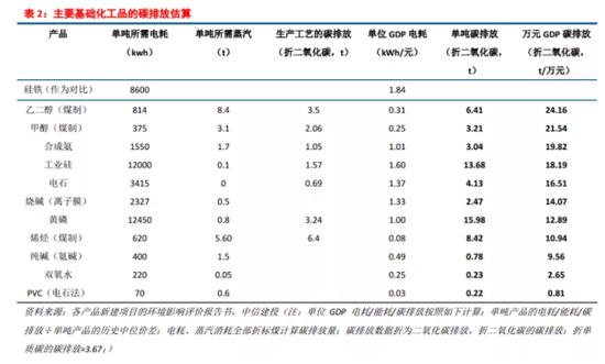 根据计算结果,单位GDP碳排放居于前列的基础化工产品分别是煤制乙二醇、煤制甲醇、合成氨、工业硅、电石、烧碱、黄磷、MTO、纯碱。集中在低附加值的大宗化工品,基本上与电耗高/电力成本占比高的产品相吻合。同时,也与内蒙古给出的禁止新建产能的化工品清单基本吻合。