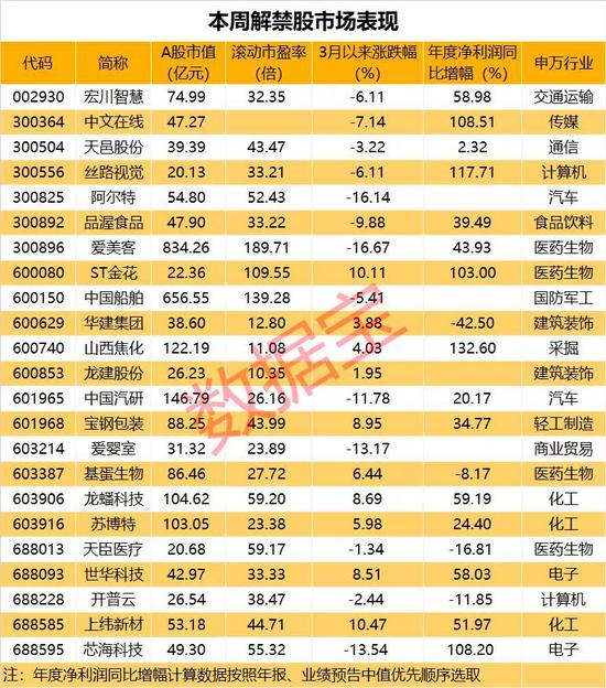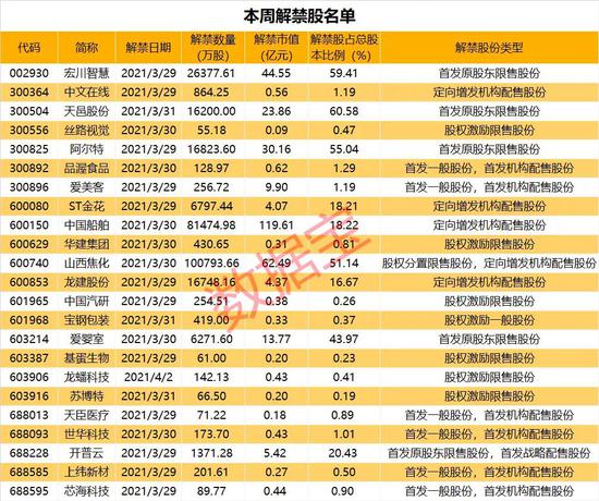 13股解禁市值不足亿元。丝路视觉的解禁压力最小,3月30日仅有55.18万股、市值941.29万的规模面临解禁。其余解禁市值较小的个股还有天臣医疗、苏博特、基蛋生物和上纬新材,解禁市值均不足3000万元。