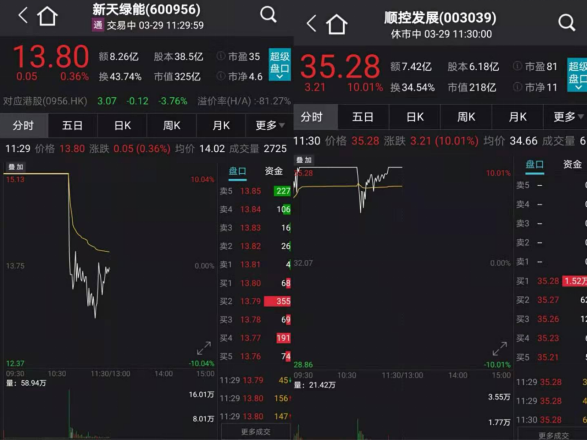 此前连续大涨的碳中和概念股今日明显后劲不足,冲高回落。10:30前后,不少个股突然异动,新天绿能、顺控发展、深圳能源纷纷炸板。截至午盘,顺控发展和深圳能源再度涨停,但新天绿能仅微涨0.36%。