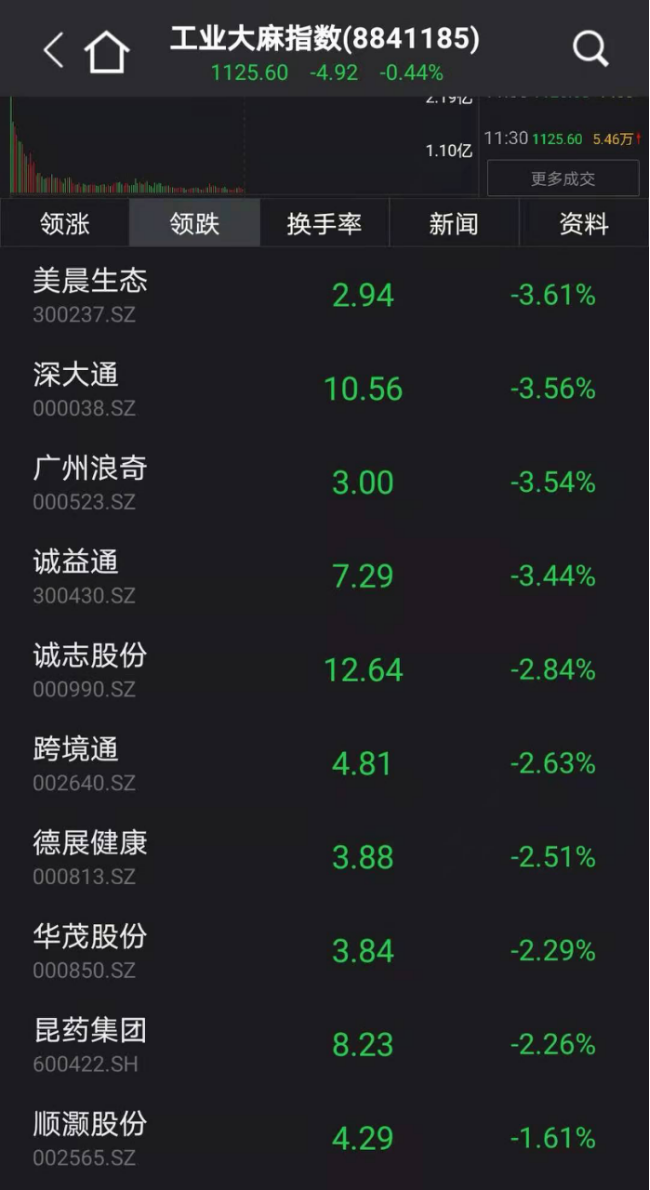 在云南白药的带动下,工业大麻板块集体下挫,截至午盘工业大麻指数下跌0.44%,美晨生态、广州浪奇(维权)、深大通(维权)、诚益通等跌幅居前。