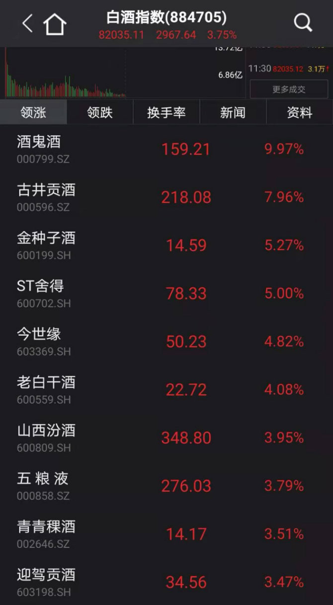 白酒板块大幅拉升,白酒板块指数上涨3.75%;板块内,ST舍得(维权)、酒鬼酒、大豪科技涨停,古井贡酒、金种子酒涨超5%。