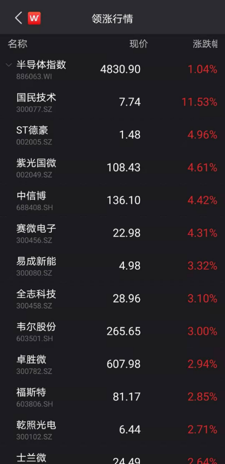 今日上午,半导体板块集体走高,广信材料、容大感光、华润微直线拉升。截至午间收盘,半导体指数涨超1%,板块内国民技术涨超11%,紫光国微、中信博、赛微电子涨超4%,易成新能、全志科技、韦尔股份涨超3%。