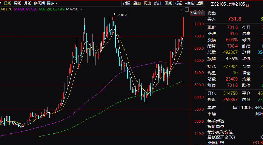 行情数据显示,今天上午国内各类煤炭期货普遍暴涨,其中动力煤主力期货合约触及涨停,涨停价位为731.8元/吨,相应涨幅达6%。