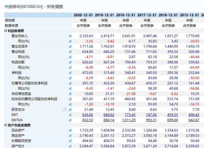 中国神华上周五晚间披露的2020年报数据显示,2020年公司实现营收2332.63亿元,同比下降3.56%,实现归母净利润391.70亿元,同比下降9.43%。