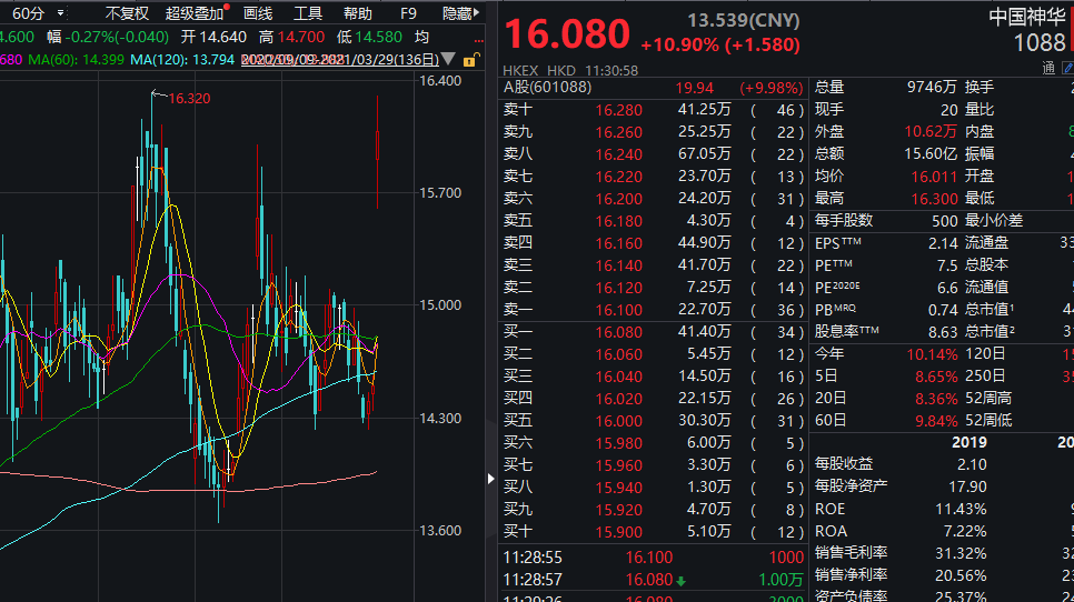中国神华港股涨势更为凌厉,上午盘中涨幅一度超过12%。中国神华的A股和港股均留下明显的向上跳空缺口。