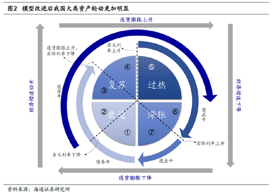 改进的模型:综合流动性、经济、通胀、实际利率因素的大类资产配置框架。考虑到美林投资时钟的局限,我们在原本的框架中加入利率,具体而言我们加入的是名义利率(代表着货币政策,如加息或降息)和实际利率(名义利率-通胀)两个流动性指标,从而使得新的投资时钟从美林的四个阶段变成了7个阶段: