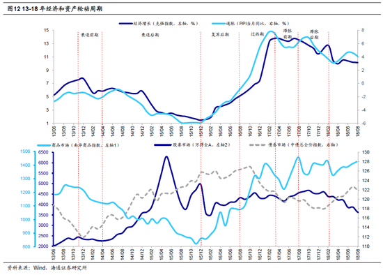 13-18年经济从衰退走向滞胀,债、股、商品依次走牛。13至18年这轮周期始于13/11,直至18/02结束。由于13年后经济和通胀不升反降,因此经济周期在上轮13年11月的复苏后期结束之后,在本轮直接转至衰退期(13/11-15/12),随后经历了复苏(15/12-16/08)、过热(16/08-17/03)和滞胀(17/03-18/02)。其中14年初货币政策的执行思路还是“ 不放松也不收紧银根 “,整体偏稳健中性,直至14年4月央行开始定向降准,货币政策才明显转向宽松,衰退也随之来到后期阶段。到了15年12月经济开始明显复苏,在供给侧改革的影响下克强指数从15年12月的1%升至17年3月的14%,同期PPI同比从-6%升至8%。16年8 月央行在确认经济复苏后重启逆回购,货币政策开始收紧,标志着经济进一步走向过热。直至17年3月,此时经济增速开始出现下滑,17年8月实际利率也在通胀增速放缓趋势下开始回升,经济相继切换至本轮最后的滞胀前期和后期。结合CPI和PPI同比的顶点来看我们认为本轮的通胀持续回升至18年2月才结束,对应本轮周期止步。观察该阶段资产表现: