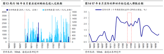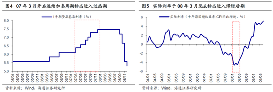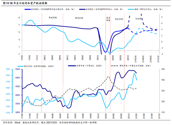 随着政策效果显现,按照美林投资时钟,经济会先进入复苏期,待通胀也起来后进入过热期。考虑流动性后,我们的划分更加细致,我们将复苏按照通胀起没起来划成复苏前期(阶段③)和复苏后期(阶段④),即实际利率(名义利率-通胀)见顶后复苏就进入了后半场。那什么时候经济从复苏走向过热(阶段⑤)?我们划分的标志是政策是否开始转向(名义利率是否回升),即政策层判断经济可能开始过热了。