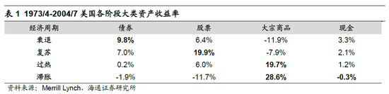 传统大类资产分析框架:美林投资时钟。谈及大类资产配置的方法论,大家往往想用到美林投资时钟下的传统资产配置框架。美林投资时钟是美林证券在2004年在《The Investment Clock》这篇报告中提出的,他们将美国1973-2004年的经济根据产出缺口和通胀两个维度划分出了四个阶段,然后回测了四个阶段中大类资产的区间收益率,最终发现经济周期每一个阶段均对应着表现超过大市的某一特定资产类别:衰退期(债券)、复苏期(股票)、过热期(商品)、滞胀期(现金),详见表1。美林投资时钟是美国历史的大致规律总结,在刚刚引入国内的时候非常好用,但13年后我国大类资产表现时常与美林投资时钟不符。例如14/7-15/6的类衰退期间,虽然GDP增速从14Q2的7.6%降至15Q2的7.1%,CPI同比从2.3%降至1.4%,但流动性的宽松推动股市走牛,上证综指在15/6/12最高涨至5178点。18/2-18/9期间,GDP增速从6.8%降至6.5%,CPI从18/3的2.1%持续升至18/9的2.5%,经济处于类滞胀阶段,但此时因经济下行压力的增大,货币政策不再收紧,进而使得这期间债市从18年初开始走牛。