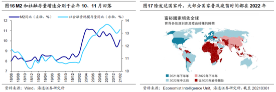 那本轮过热阶段会持续多久,何时会进入新的滞胀期?我们认为,21年经济动能依然存在,全年实际GDP增速有望达9%,虽然经济增速的单季度同比高点大概率在21Q1,但是类似10年,剔除低基数影响后真正的经济顶更可能在21Q4或22Q1。通胀方面,虽然从数据看当前处于经济和通胀往上的过热期,但实际本阶段的通胀压力并不大。07、10年过热期间PPI同比平均在3%和6%左右,而今年1月PPI同比才刚转正,万得一致预期数据显示今年CPI和PPI全年同比增速分别为1.6%和2.3%。目前(截至20210323)发达国家疫苗接种明显较快,如美国目前接种率约为39%,但全球的接种率只有约6%,经济学人预测疫苗在发达国家普及大概在今年下半年能完成。除发达国家以外的其他国家疫苗普及都要等到2022年,届时海外的需求才会大幅回升,进而造成通胀的大幅攀升。综合来看我们认为今年全年将处于过热期,滞胀期大概率要等明年。