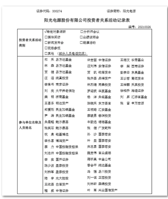 阳光电源披露,公司于3月26日下午接受了特定对象调研,公司董事长曹仁贤、董事会秘书解小勇在公司会议室接待了前来参加的机构调研团队(部分人员电话交流)。
