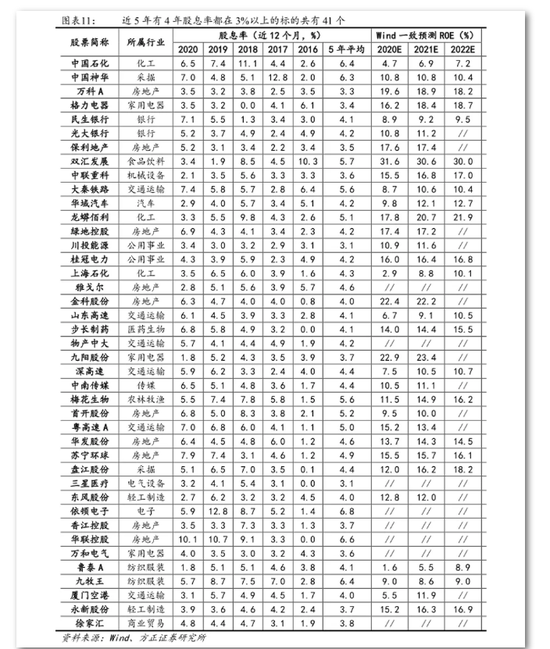 过去5年有4年股息率都在3%以上的个股名单 来源:方正证券