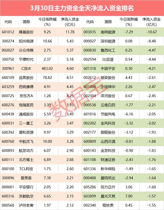 主力资金净流出个股中,碳中和龙头南网能源主力资金净流出10.67亿元,净流出资金最多;其次是深圳能源、鲁西化工,净流出资金分别为8.48亿元、4.47亿元。