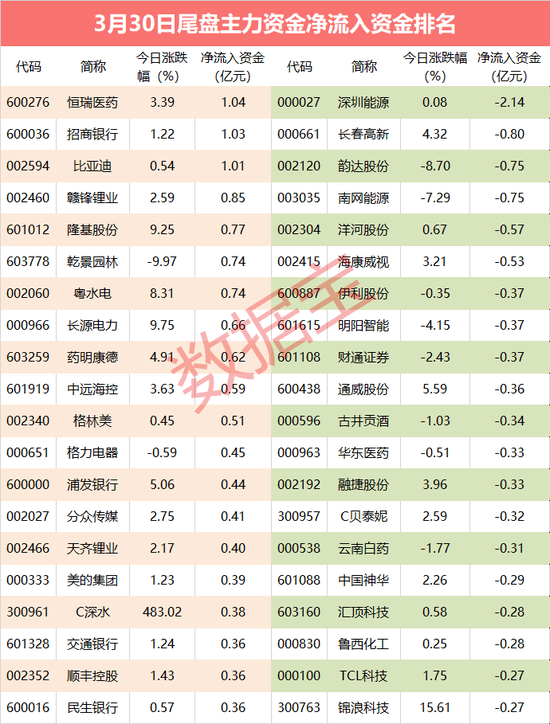 从个股尾盘资金流向数据看,有23股尾盘净流入资金超过3000万元,恒瑞医药、招商银行、比亚迪等个股尾盘资金净流入金额最多,分别高达1.04亿元、1.03亿元、1.01亿元;深圳能源、长春高新、韵达股份等个股尾盘资金净流出金额居前,分别流出2.14亿元、7994.9万元、7504.87万元。