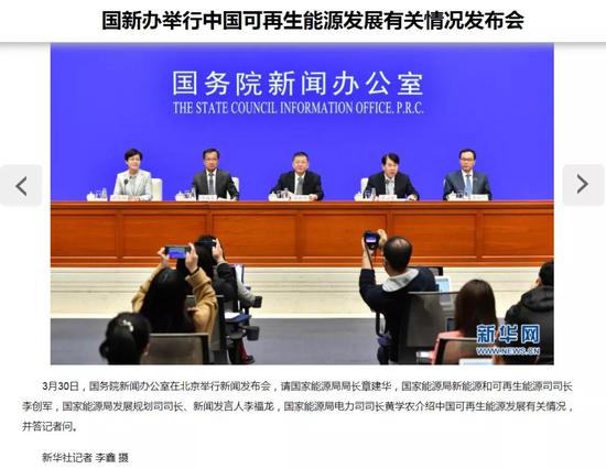 据新华社报道,3月30日,国务院新闻办公室在北京举行新闻发布会,请国家能源局局长章建华,国家能源局新能源和可再生能源司司长李创军,国家能源局发展规划司司长、新闻发言人李福龙,国家能源局电力司司长黄学农介绍中国可再生能源发展有关情况。