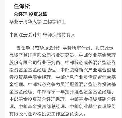 但任泽松管理的基金中有多只买入乐视网,且持有数量非常大;除乐视网外,2017年、2018年还持有尔康制药(维权)、宣亚科技等个股,也相继踩雷。受此影响,基金业绩也普遍不佳。2018年6月25日,中邮基金发布公告表示,任泽松因个人原因离任。随后,任泽松转战私募基金集元资产,担任集元资产总经理、投资总监。