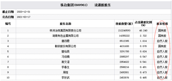 株冶集团前十大流通股股东中也无基金持股。截至2020年12月31日,株冶集团前十大流通股股东为国有股与自然人股。株洲冶炼集团有限责任公司作为第一大流通股股东,持股数量为2.12亿股,占流通股比例40.24%。
