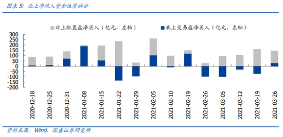 北上入场步伐继续加快,配置盘与交易盘同步加仓。上周北上大幅流入141.64亿元,南下资金净流出53.84亿元。根据我们对陆股通资金的拆解和估算,北上配置盘净流入规模为112.07亿元,连续三周净流入超百亿,交易盘本周同步加仓,净流入31.62亿元,配置盘和交易盘今年以来累计净流入分别达到1198.86亿元和-3.16亿元。上周主板仓位下降,创业板和科创板仓位上升,截至3月26日,陆股通主板、创业板、科创板持仓比例分别为86.84%、13.02%和0.14%。