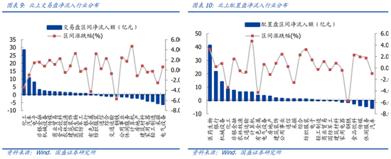 从资金性质拆分看,交易盘主要流入化工、汽车和电子行业,分别净流入28.42亿元、10.8亿元和7.92亿元;同时集中流出电气设备、采掘和轻工制造行业,分别净流出6.04亿元、5.46亿元和4.08亿元;配置盘主要流入医药生物、银行和机械设备行业,分别净流入41.2亿元、21.55亿元和13.88亿元;主要流出汽车、休闲服务和传媒行业,分别净流出5.83亿元、4.42亿元和3.67亿元。