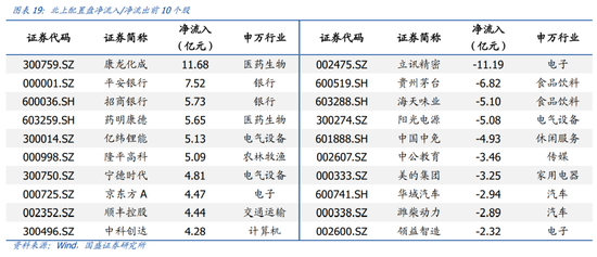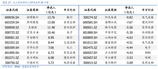 从整体净流入看,上周招商银行、药明康德、五粮液、京东方A、平安银行净流入居前,分别净流入13.76亿元、13.08亿元、11.48亿元、10.46亿元、8.9亿元;同时阳光电源、海螺水泥、格力电器、中国中免、山西汾酒减持较多,分别净流出9.82亿元、7.67亿元、5.56亿元、5.3亿元、4.63亿元。