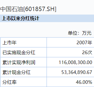 实力强劲的“两桶油”,近三年分红率均保持50%以上。2020年度,中国石油以168.4%的高分红率略胜一筹。据统计,自2007年上市以来,中国石油实施现金分红26次,累计现金分红5336.49亿元,平均分红率为46%。