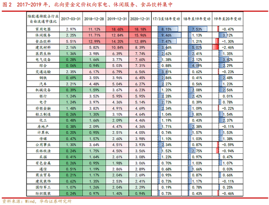 外资的选股审美对A股定价逻辑产生影响,A股由PEG向DCF估值定价转变。从外资持仓风格来看,2017年后陆股通持续加仓白酒、家电、医药等消费板块,截至2020年底,陆股通持股占行业自由流通市值占比TOP3的行业分别为:家用电器(18.18%)、休闲服务(15.96%)、食品饮料(12.89%);从持股市值TOP100角度看,截至2020年底陆股通重仓个股多集中在医药生物、电气设备、食品饮料、电子、大金融板块,多为大消费与各行业龙头。总结来看,外资偏好长期业绩持续稳定的公司,部分个股在盈利稳健成长下也迎来估值的提振,其中核心标的被称为A股“核心资产”,主要是消费、医药、科技等行业中业绩成长性较强、具备护城河、技术实力较强的部分龙头公司。