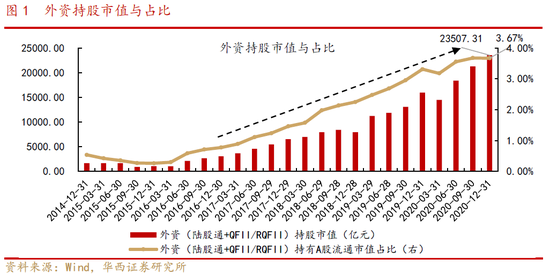 2017年来A股资金结构发生变化,外资加速流入并成为A股重要的边际增量资金,对A股的话语权提升。2015年沪港通开通交易以来,中国资本市场对外开放全面提速,以2016年12月深港通开通为标志,2017年来外资呈现加速流入趋势。外资持股层面,2016年底陆股通与QFII/RQFII持股市值为3026亿元,占A股流通市值比为0.77%;2020年底,外资持股市值已升至2.35万亿,占A股流通市值比升至3.67%,四年间外资持股市值提升将近7倍,持A股比例提升2.9个百分点。外资净流入层面,2017年、2018年、2019年北向资金分别净流入1997亿元、2942亿元、3517亿元,2020年外资边际流入放缓,净流入达2089亿元。