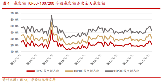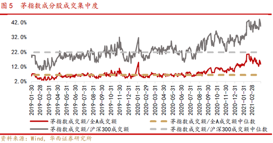 五、A股核心资产将何时企稳?核心资产交易集中度虽高,但资金结构相对合理,与2014-2015年市场交易极度集中不同,本次抱团资金以低杠杆机构基金为主,高杠杆配资不多,A股杠杆水平处在比较合理的位置,整体上杠杆风险可控。春节以来茅指数跌去近20%的收益,短期的调整已释放大部分风险,进一步大跌空间有限,后续进入反复磨底的阶段,季报期可能会出现短期反弹。而当筹码充分交换后,市场交易结构有望阶段性改善。可关注以下两个指标:1)个股成交集中度回落至历史中位数附近—2013年来TOP50/100/200个股成交额占比中位数分别为20.1%/29.3%/41.6%;2)茅指数成交额占比回落至2019年以来中枢附近。