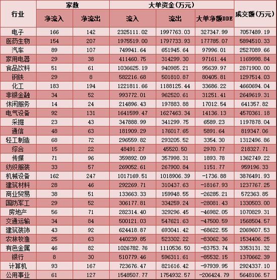从资金层面看,市场停止连续3天的净流出态势,周四,DDE大单净额流入达20.72亿元。行业方面,有16类行业呈净流入态势,前三位分别为:电子(327347.99万元)、医药生物(177785.07万元)、汽车(97996.01万元)。