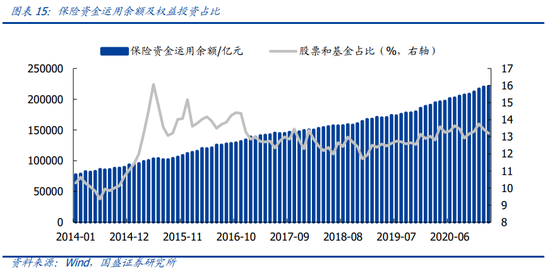 2月保险资金投资股票和基金规模减少415亿元,较上月多减少了147亿元,今年前2月合计减少682亿元。险资权益投资披露口径为股票和基金合计占比,直接股票投资占比不定期披露。截止2月,险资运用余额达到22.07万亿,其中股票和基金投资规模为2.91万亿,占比为13.20%,较上月分别减少147亿元、减少0.24pct。