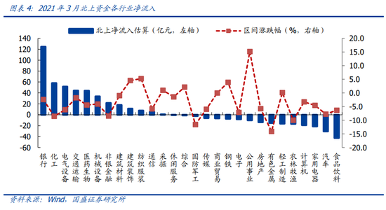 3月北上主要净流入银行、化工和电气设备,分别净流入124亿元、58亿元和52亿元;同时,食品饮料、汽车和家用电器行业流出居多,分别净流出43亿元、30亿元和21亿元。